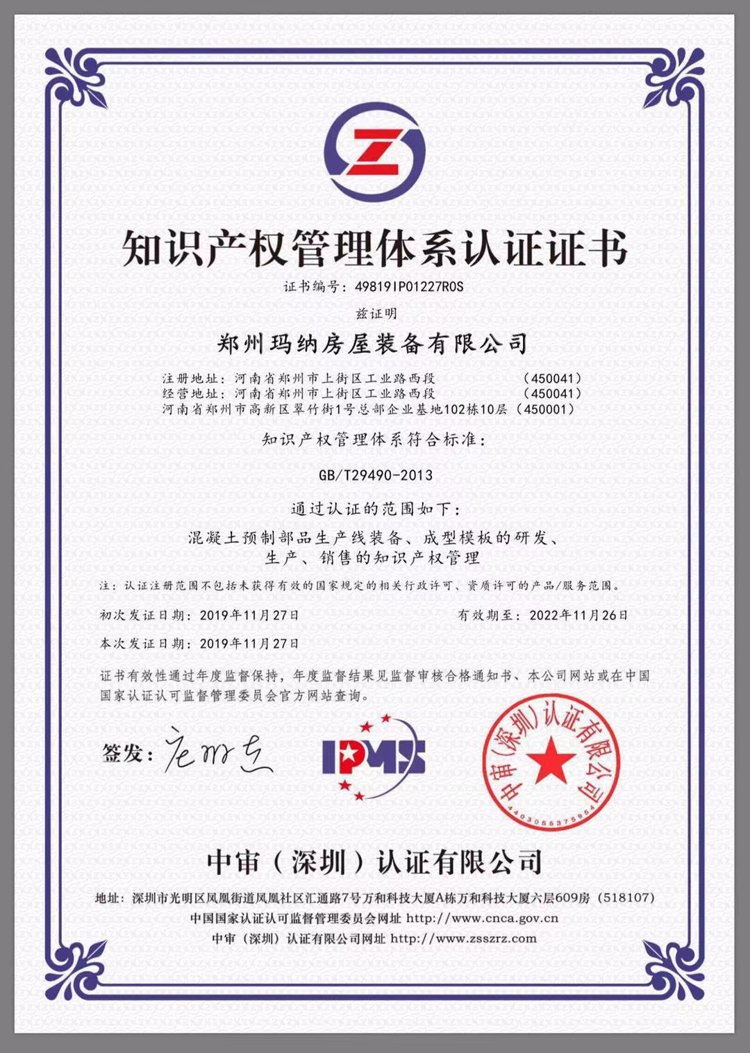 2019年11月27日,鄭州瑪納房屋裝備有限公司獲得第三方認證機構(gòu)頒發(fā)的《知識產(chǎn)權(quán)管理體系認證證書》,