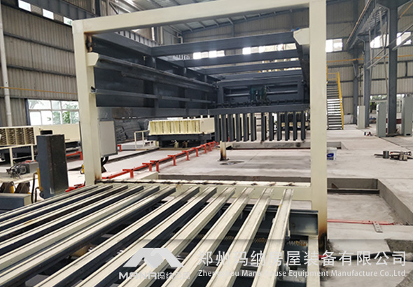 開模完成后,由推板出板機(jī)把成型墻板推出到合板翻板機(jī),6塊為一組合攏在一起,打包。由叉車運(yùn)出成品堆場(chǎng)。