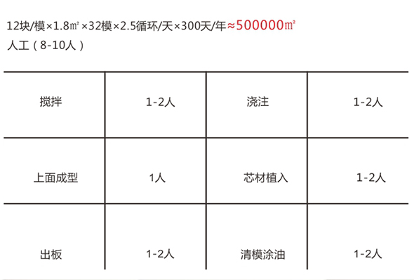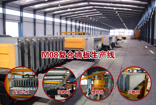 M08復(fù)合墻板生產(chǎn)線主要設(shè)備組成有:集約式低能耗養(yǎng)護(hù)室、第三代成組立模、立;剞D(zhuǎn)機(jī)、上抹面成型機(jī)、第三代液壓抽芯機(jī)、壓力注料系統(tǒng)、合板翻板機(jī)構(gòu)、推板機(jī)構(gòu),標(biāo)準(zhǔn)生產(chǎn)線產(chǎn)能年產(chǎn)達(dá)50萬㎡(2440mmX610mm)。