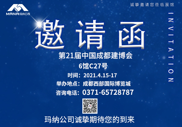 瑪納公司受邀參加4月15日-17日在成都西部博覽城的第21屆中國(guó)成都建博會(huì),誠(chéng)摯邀請(qǐng)您蒞臨瑪納公司展位(6館C27號(hào)),期待您的到來(lái)!