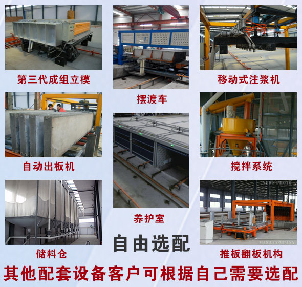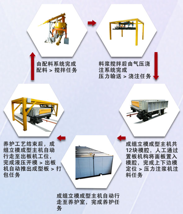 整個過程:配料→攪拌→置板→壓力輸送→澆注入模→養(yǎng)護→開!霭鍣C出板→循環(huán)
