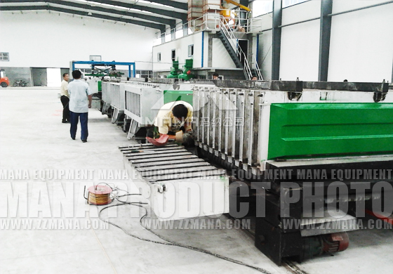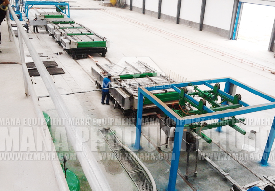 - 5)出板系統(tǒng):等養(yǎng)護(hù)完成后,自動(dòng)行走至出板機(jī)構(gòu)工位,液壓開(kāi)模,再由出板機(jī)把成型板推出,以供打包。